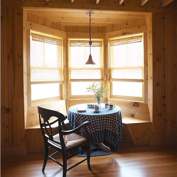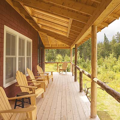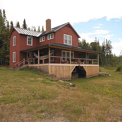 The owners, an extended family, wanted a camp with large porches where they could spend most of the summer and a rustic, cozy interior for dreary days. They chose the camp's cruciform shape for its maximum ventilation and views; most of the rooms have windows on three walls.