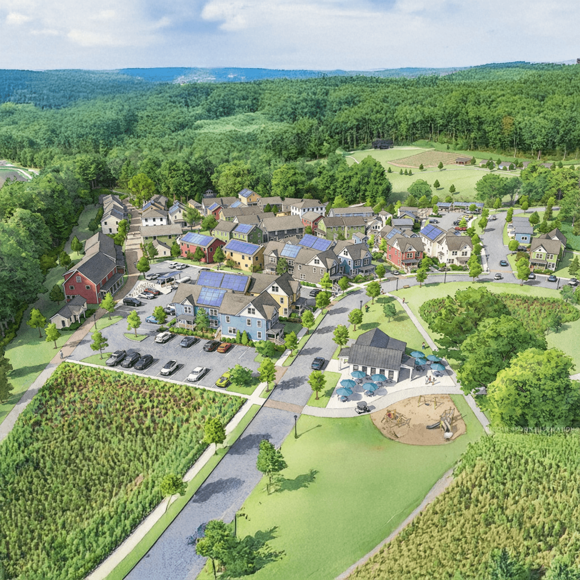 Most of the homes are in a pedestrian village which features small common greens and community buildings. The developer team is proposing district geothermal heat, a multi-modal system to reduce car ownership, a community farm, and critical community services like a farmstand, a mail room, a health clinic, a barbershop, exercise space, laundries, and a café.