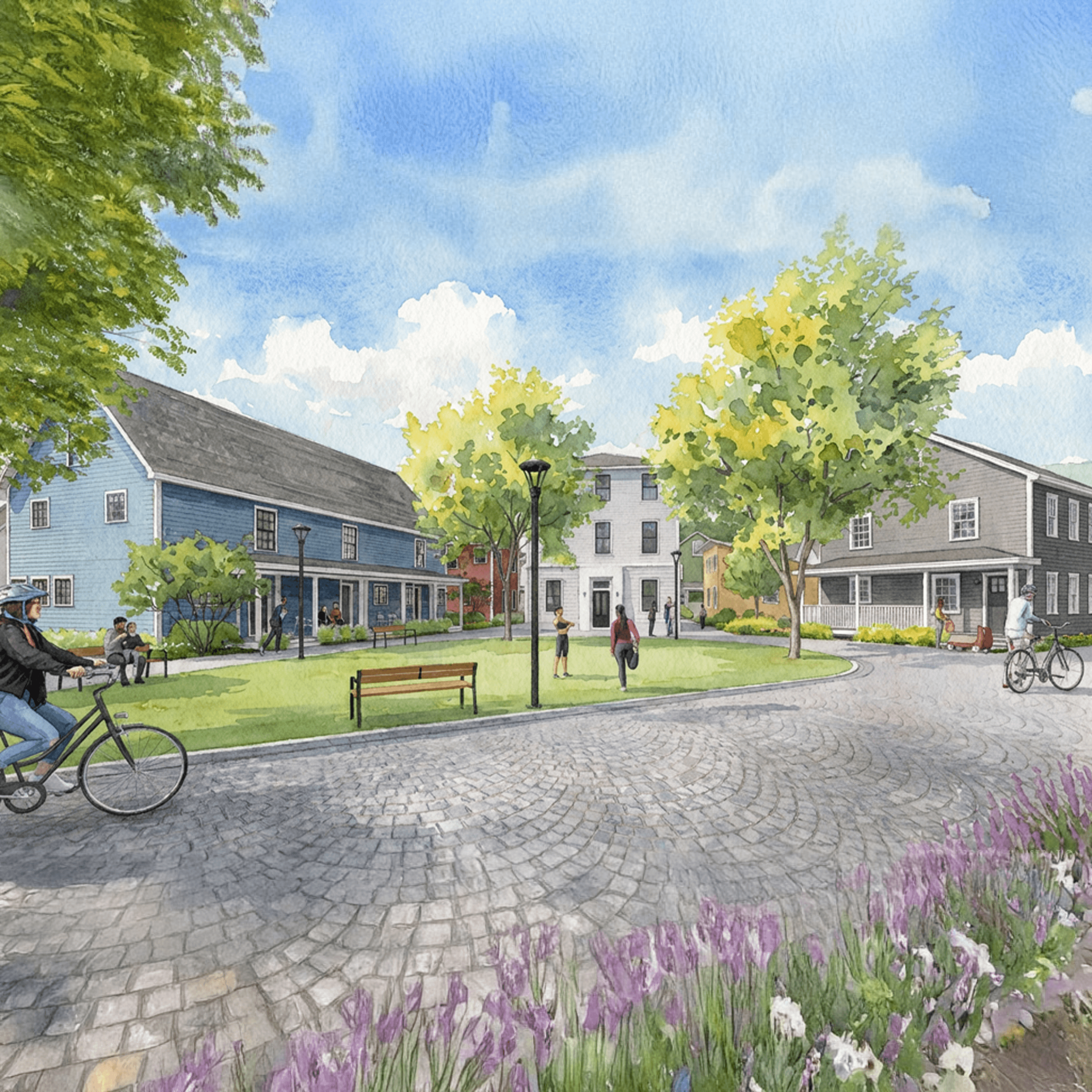 The City of Montpelier purchased an old golf course in 2022, and last year invited developers to propose a new neighborhood for the city. This design is one of four proposals at concept phase. It features 300 affordable homes (defined as 0 – 150% of area median income), with over 250 able to be owned.