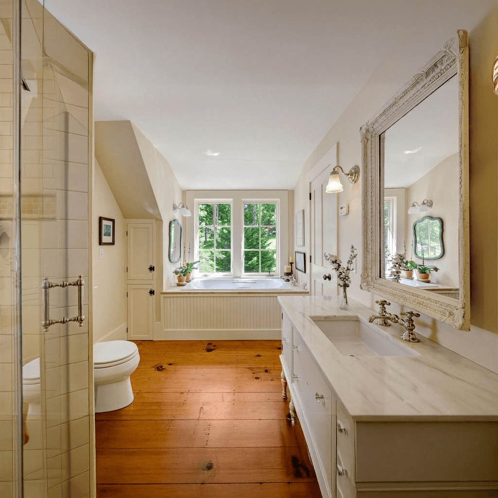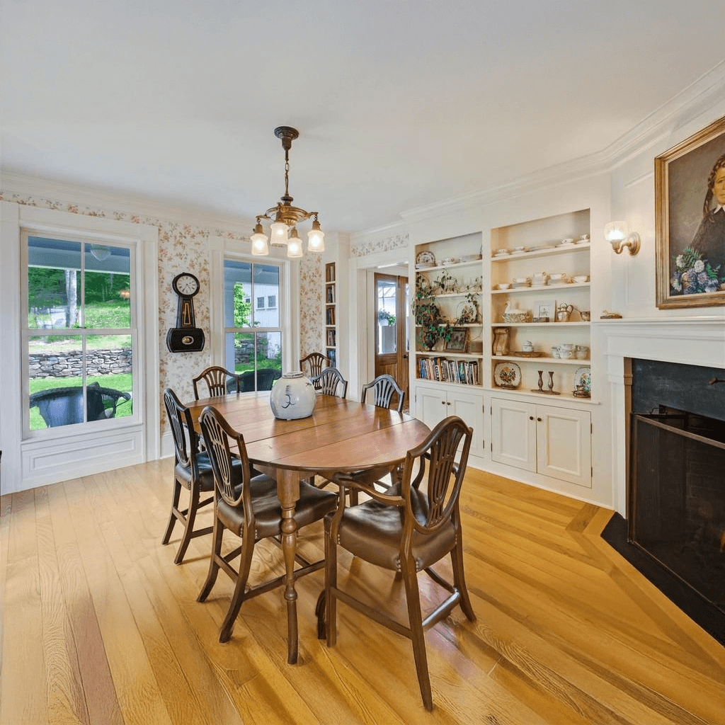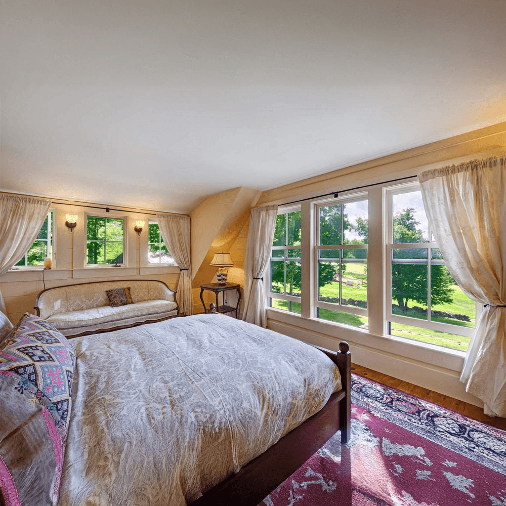 The farmhouse is a robust Greek Revival style, with plenty of porches, dormers, and ells added on.